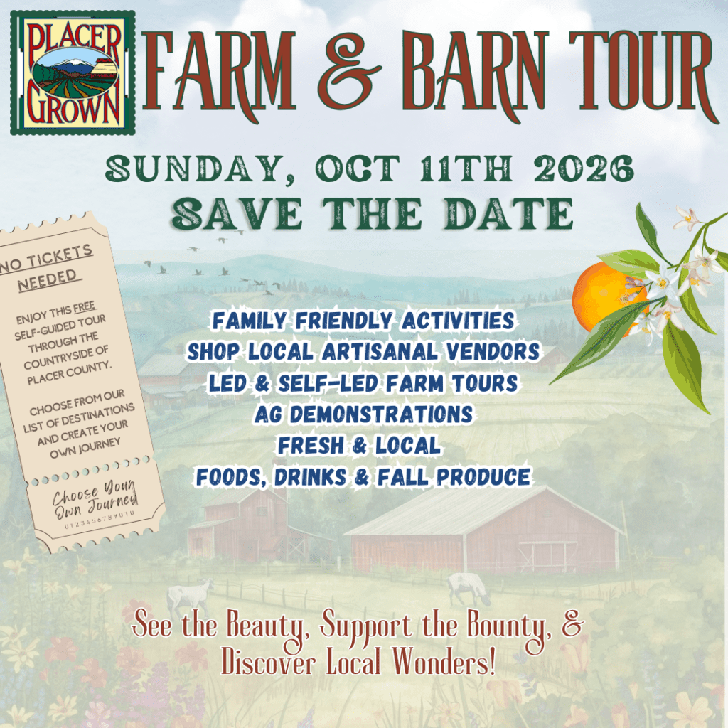 Save the Date OCTOBER 11th 2026 – Enjoy this FREE self-guided tour through the farms and ranches of Placer County. Choose your stops and experience family-friendly activities, farm tours, and agricultural demonstrations while shopping local artisanal vendors and enjoying fresh, local foods, drinks, and fall produce along the way.